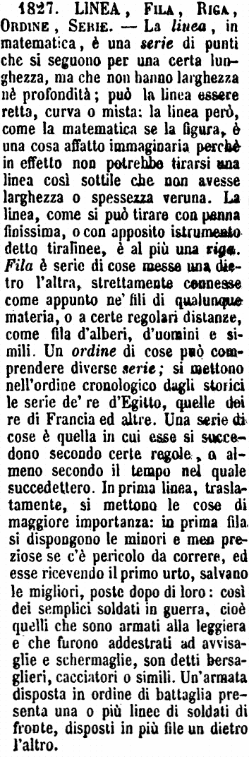 | Linea, Fila, Riga, Ordine, Serie - La linea, in matematica, è una serie di punti che si seguono per una certa lunghezza, ma che non hanno larghezza nè profondità; può la linea essere retta, curva o mista: la linea però, come la matematica se la figura, è una cosa affatto immaginaria perchè in effetto non potrebbe tirarsi una linea così sottile che non avesse larghezza o spessezza veruna. La linea, come si può tirare con penna finissima, o con apposito istrumento detto tiralinee, è al più una riga. Fila è serie di cose messe una dietro l'altra, strettamente connesse come appunto ne' fili di qualunque materia, o a certe regolari distanze, come fila d'alberi, d'uomini e simili. Un ordine di cose può comprendere diverse serie; si mettono nell'ordine cronologico dagli storici le serie de' re d'Egitto, quelle dei re di Francia ed altre. Una serie di cose è quella in cui esse si succedono secondo certe regole, o almeno secondo il tempo nel quale succedettero. In prima linea, traslatamente, si mettono le cose di maggiore importanza: in prima fila si dispongono le minori e men preziose se c'è pericolo da correre, ed esse ricevendo il primo urto, salvano le migliori, poste dopo di loro: così dei semplici soldati in guerra, cioè quelli che sono armati alla leggiera e che furono addestrati ad avvisaglie e schermaglie, son detti bersaglieri, cacciatori o simili. Un'armata disposta in ordine di battaglia presenta una o più linee di soldati di fronte, disposti in più file un dietro l'altro. [immagine] |