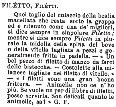 | Intrecciando le lettere di "filetti" (*) con un'altra parola si può ottenere: * gi = figlietti; * ago = fagioletti; * lago = flagioletti. |