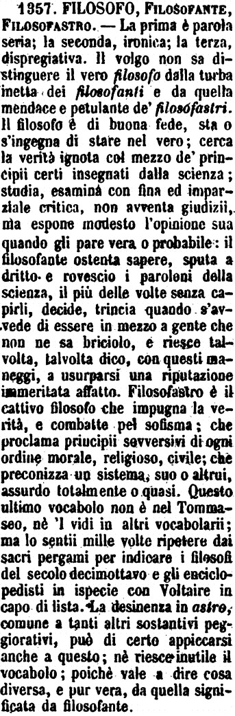 | Filosofo, Filosofante, Filosofastro - La prima è parola seria; la seconda, ironica; la terza, dispregiativa. Il volgo non sa distinguere il vero filosofo dalla turba inetta dei filosofanti e da quella mendace e petulante de' filosofastri. Il filosofo è di buona fede, sta o s'ingegna di stare nel vero; cerca la verità ignota col mezzo de' principii certi insegnati dalla scienza; studia, esamina con fina ed imparziale critica, non avventa giudizii, ma espone modesto l'opinione sua quando gli pare vera o probabile: il filosofante ostenta sapere, sputa a diritto e rovescio i paroloni della scienza, il più delle volte senza capirli, decide, trincia quando s'avvede di essere in mezzo a gente che non ne sa briciolo, e riesce talvolta, talvolta dico, con questi maneggi, a usurparsi una riputazione immeritata affatto. Filosofastro è il cattivo filosofo che impugna la verità, e combatte pel sofisma; che proclama principii sovversivi di ogni ordine morale, religioso, civile; che preconizza un sistema, suo o altrui, assurdo totalmente o quasi. Questo ultimo vocabolo non è nel Tommaseo, né 'l vidi in altri vocabolarii; ma lo sentii mille volte ripetere dai sacri pergami per indicare i filosofi del secolo decimottavo e gli enciclopedisti in ispecie con Voltaire in capo di lista. La desinenza in astro, comune a tanti altri sostantivi peggiorativi, può di certo appiccarsi anche a questo; né riesce inutile il vocabolo; poiché vale a dire cosa diversa, e pur vera, da quella significata da filosofante. [immagine] |