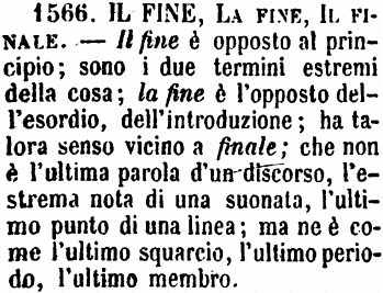 | Il fine, La fine, Il finale - Il fine è opposto al principio; sono i due termini estremi della cosa; la fine è l'opposto dell'esordio, dell'introduzione; ha talora senso vicino a finale; che non è l'ultima parola d'un discorso, l'estrema nota di una suonata, l'ultimo punto di una linea; ma ne è come l'ultimo squarcio, l'ultimo periodo, l'ultimo membro. [immagine] |