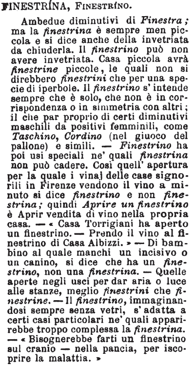 | Finestrina, Finestrino - Ambedue diminutivi di Finestra; ma la finestrina è sempre men piccola e si dice anche della invetriata da chiuderla. Il finestrino può non avere invetriata. Casa piccola avrà finestrine piccole, le quali non si direbbero finestrini che per una specie di iperbole. Il finestrino s'intende sempre che è solo, che non è in corrispondenza o in simmetria con altri; il che par proprio di certi diminutivi maschili da positivi femminili, come Taschino, Cordino (nel giuoco del pallone) e simili. - Finestrino ha poi usi speciali ne' quali finestrina non può cadere. Così quell'apertura per la quale i vinaj delle case signorili in Firenze vendono il vino a minuto si dice finestrino e non finestrina; quindi Aprire un finestrino è Aprir vendita di vino nella propria casa. - « Casa Torrigiani ha aperto un finestrino. - Prendo il vino al finestrino di Casa Albizzi. » - Di bambino al quale manchi un incisivo o un canino, si dice che ha un finestrino, non una finestrina. - Quelle aperte negli usci per dar aria o luce alle stanze, meglio finestrini che finestrine. - Il finestrino, immaginandosi sempre senza vetri, s'adatta a certi casi particolari ne' quali apparirebbe troppo complessa la finestrina. - « Bisognerebbe farti un finestrino sul cranio - nella pancia, per iscoprire la malattia. » [immagine] |