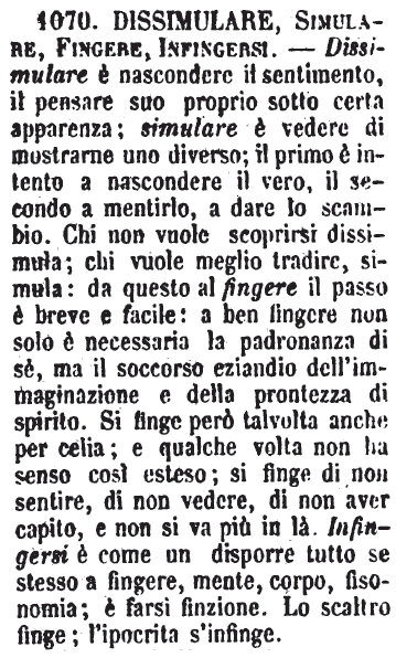 | Dissimulare, Simulare, Fingere, Infingersi - Dissimulare è nascondere il sentimento, il pensare suo proprio sotto certa apparenza; simulare è vedere di mostrarne uno diverso; il primo è intento a nascondere il vero, il secondo a mentirlo, a dare lo scambio. Chi non vuole scoprirsi dissimula; chi vuole meglio tradire, simula: da questo al fingere il passo è breve e facile: a ben fingere non solo è necessaria la padronanza di sé, ma il soccorso eziandio dell'immaginazione e della prontezza di spirito. Si finge però talvolta anche per celia; e qualche volta non ha senso così esteso; si finge di non sentire, di non vedere, di non aver capito, e non si va più in là. Infingersi è come un disporre tutto se stesso a fingere, mente, corpo, fisonomia; è farsi finzione. Lo scaltro finge; l'ipocrita s'infinge. [immagine] |