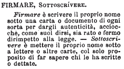 | Firmare, Sottoscrivere - Firmare è scrivere il proprio nome sotto una carta o documento di ogni sorta per dargli autenticità, acciocchè, come suol dirsi, sia rato e fermo dirimpetto alla legge. - Sottoscrivere è mettere il proprio nome sotto a lettere o altre carte, col solo proposito di far sapere chi le ha scritte o dettate. [immagine] |