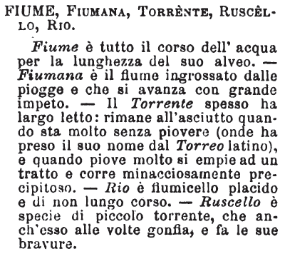 | Fiume, Fiumana, Torrente, Ruscello, Rio - Fiume è tutto il corso dell'acqua per la lunghezza del suo alveo. - Fiumana è il fiume ingrossato dalle piogge e che si avanza con grande impeto. - Il Torrente spesso ha largo letto: rimane all'asciutto quando sta molto senza piovere (onde ha preso il suo nome dal Torreo latino), e quando piove molto si empie ad un tratto e corre minacciosamente precipitoso. - Rio è fiumicello placido e di non lungo corso. - Ruscello è specie di piccolo torrente, che anch'esso alle volte gonfia, e fa le sue bravure. [immagine] |