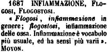| Infiammazione, Flogosi, Flogostosi - «Flogosi, infiammazione in genere; flogostosi, infiammazione delle ossa. Infiammazione è vocabolo più usuale, ed ha sensi più varii». Moyon. [immagine] |