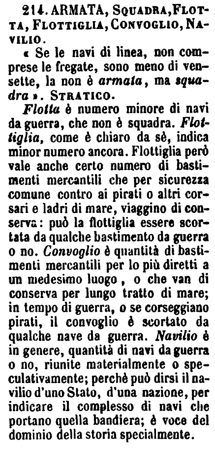 | Armata, Squadra, Flotta, Flottiglia, Convoglio, Navilio - «Se le navi di linea, non comprese le fregate, sono meno di ventisette, la non è armata, ma squadra». Stratico.