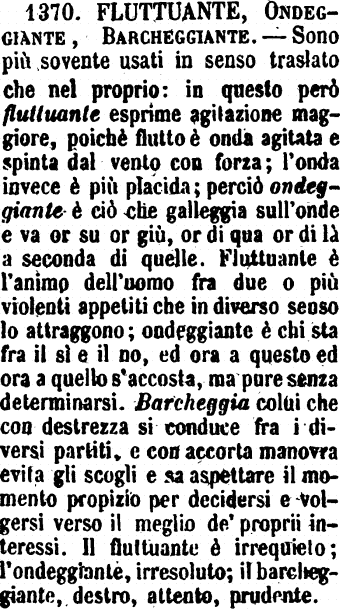 | Fluttuante, Ondeggiante, Barcheggiante - Sono più sovente usati in senso traslato che nel proprio: in questo però fluttuante esprime agitazione maggiore, poichè flutto è onda agitata e spinta dal vento con forza; l'onda invece è più placida; perciò ondeggiante è ciò che galleggia sull'onde e va or su or giù, or di qua or di là a seconda di quelle. Fluttuante è l'animo dell'uomo fra due o più violenti appetiti che in diverso senso lo attraggono; ondeggiante è chi sta fra il sì e il no, ed ora a questo ed ora a quello s'accosta, ma pure senza determinarsi. Barcheggia colui che con destrezza si conduce fra i diversi partiti, e con accorta manovra evita gli scogli e sa aspettare il momento propizio per decidersi e volgersi verso il meglio de' proprii interessi. Il fluttuante è irrequieto; l'ondeggiante, irresoluto; il barcheggiante, destro, attento, prudente. [immagine] |