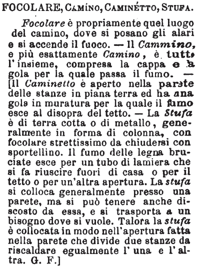| Focolare, Camino, Caminetto, Stufa - Focolare è propriamente quel luogo del camino, dove si posano gli alari e si accende il fuoco. - Il Cammino, e più esattamente Camino, è tutto l'insieme, compresa la cappa e la gola per la quale passa il fumo. - [Il Caminetto è aperto nella parete delle stanze in piana terra ed ha una gola in muratura per la quale il fumo esce al disopra del tetto. - La Stufa è di terra cotta o di metallo, generalmente in forma di colonna, con focolare strettissimo da chiudersi con sportellino. Il fumo delle legna bruciate esce per un tubo di lamiera che si fa riuscire fuori di casa o per il tetto o per un'altra apertura. La stufa si colloca generalmente presso una parete, ma si può tenere anche discosto da essa, e si trasporta a un bisogno dove si vuole. Talora la stufa è collocata in modo nell'apertura fatta nella parete che divide due stanze da riscaldare egualmente l'una e l'altra. G. F.] [immagine] |