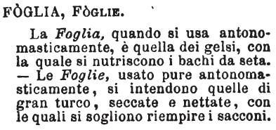 | Foglia, Foglie - La Foglia, quando si usa antonomasticamente, è quella dei gelsi, con la quale si nutriscono i bachi da seta.