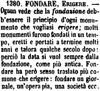 | Fondare, Erigere - Ognun vede che la fondazione debb'essere il principio d'ogni monumento che vogliasi erigere; molti monumenti furono fondati in un tempo, eretti e portati a termine molti anni e talora qualche secolo dopo: perciò la data si vuol sempre dalla fondazione, come più antica. Fondare ha però senso traslato più comune che erigere: fondare un giornale, un'opera pia, una società ecc. [immagine] |