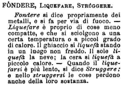 | Fondere, Liquefare, Struggere - Fondere si dice propriamente dei metalli, e si fa per via di fuoco. - Liquefare è proprio di cose meno compatte, e che si sciolgono a una certa temperatura o a piccol grado di calore. Il ghiaccio si liquefà stando in un luogo non freddo. Il sole liquefà la neve; la cera si liquefà a piccolo calore. - Quando il liquefarsi è più lento, si dice Struggere; e nello struggersi le cose perdono anche della loro sostanza. [immagine] |