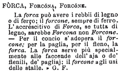 | Forca, Forcona, Forcone - La forca può avere i rebbii di legno o di ferro; il forcone, sempre di ferro. L'accrescitivo di Forca, se tutta di legno, sarebbe Forcona non Forcone. - Per il concio s'adopera il forcone; per la paglia, per il fieno, la forca. La forca serve più specialmente alle faccende dell'aja o de' fienili, de' pagliaj; il forcone agli usi delle stalle. » G.F. [immagine] |
