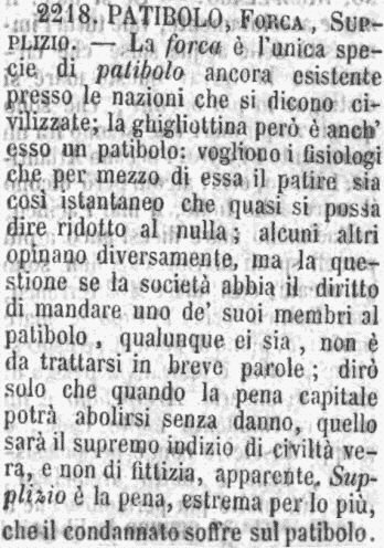 | Patibolo, Forca, Supplizio - La forca è l'unica specie di patibolo ancora esistente presso le nazioni che si dicono civilizzate; la ghigliottina però è anch'esso un patibolo: vogliono i fisiologi che per mezzo di essa il patire sia così istantaneo che quasi si possa dire ridotto al nulla; alcuni altri opinano diversamente, ma la questione se la società abbia il diritto di mandare uno de' suoi membri al patibolo, qualunque ei sia, non è da trattarsi in breve parole; dirò solo che quando la pena capitale potrà abolirsi senza danno, quello sarà il supremo indizio di civiltà vera, e non di fittizia, apparente. Supplizio è la pena, estrema per lo più, che il condannato soffre sul patibolo. [immagine] |