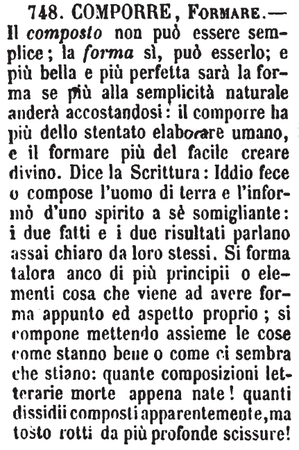 | Comporre, Formare - Il composto non può essere semplice; la forma sì, può esserlo; e più bella e più perfetta sarà la forma se più alla semplicità naturale anderà accostandosi: il comporre ha più dello stentato elaborare umano, e il formare più del facile creare divino. Dice la Scrittura: Iddio fece e compose l'uomo di terra e l'informò d'uno spirito a sè somigliante: i due fatti e i due risultati parlano assai chiaro da loro stessi. Si forma talora anco di più principii o elementi cosa che viene ad avere forma appunto ed aspetto proprio; si compone mettendo assieme le cose come stanno bene o come ci sembra che stiano: quante composizioni letterarie morte appena nate! quanti dissidii composti apparentemente, ma tosto rotti da più profonde scissure! [immagine] |