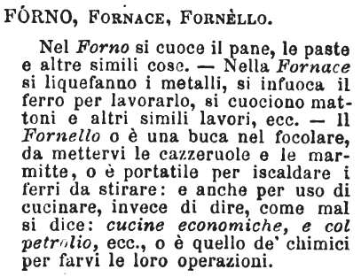 | Forno, Fornace, Fornello - Nel Forno si cuoce il pane, le paste e altre simili cose. - Nella Fornace si liquefanno i metalli, si infuoca il ferro per lavorarlo, si cuociono mattoni e altri simili lavori, ecc. - Il Fornello o è una buca nel focolare, da mettervi le cazzeruole e le marmitte, o è portatile per iscaldare i ferri da stirare: e anche per uso di cucinare, invece di dire, come mal si dice: cucine economiche, e col petrolio, ecc., o è quello de' chimici per farvi le loro operazioni. [immagine] |