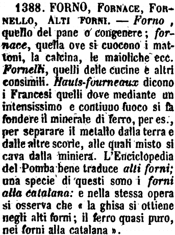| Forno, Fornace, Fornello, Alti forni - Forno, quello del pane o congenere; fornace, quella ove si cuocono i mattoni, la calcina, le maioliche ecc. Fornelli, quelli delle cucine e altri consimili. Hauts-fourneaux dicono i Francesi quelli dove mediante un intensissimo e continuo fuoco si fa fondere il minerale di ferro, per es., per separare il metallo dalla terra e dalle altre scorie, alle quali misto si cava dalla miniera. L'Enciclopedia del Pomba bene traduce alti forni; una specie di questi sono i forni alla catalana: e nella stessa opera si osserva che «la ghisa si ottiene negli alti forni; il ferro quasi puro, nei forni alla catalana». [immagine] |