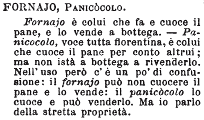 | Fornajo, Panicocolo - Fornajo è colui che fa e cuoce il pane, e lo vende a bottega. - Panicocolo, voce tutta fiorentina, è colui che cuoce il pane per conto altrui; ma non istà a bottega a rivenderlo. Nell'uso però c'è un pò di confusione: il fornajo può non cuocere il pane e lo vende: il panicocolo lo cuoce e può venderlo. Ma io parlo della stretta proprietà. [immagine] |