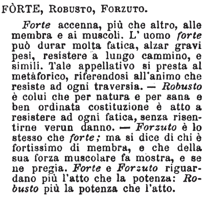 | Forte, Robusto, Forzuto - Forte accenna, più che altro, alle membra e ai muscoli. L'uomo forte può durar molta fatica, alzar gravi pesi, resistere a lungo cammino, e simili. Tale appellativo si presta al metàforico, riferendosi all'animo che resiste ad ogni traversia. - Robusto è colui che per natura e per sana e ben ordinata costituzione è atto a resistere ad ogni fatica, senza risentirne verun danno. - Forzuto è lo stesso che forte; ma si dice di chi è fortissimo di membra, e che della sua forza muscolare fa mostra, e se ne pregia. Forte e Forzuto riguardano più l'atto che la potenza: Robusto più la potenza che l'atto. [immagine] |