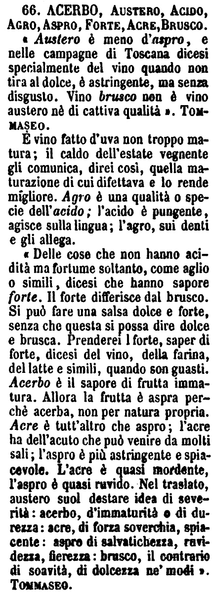 « Delle cose che non hanno acidità ma fortume soltanto, come aglio o simili, dicesi che hanno sapore forte. Il forte differisce dal brusco. Si può fare una salsa dolce e forte, senza che questa si possa dire dolce e brusca. Prendere il forte, saper di forte, dicesi del vino, della farina, del latte e simili, quando son guasti. Acerbo è il sapore di frutta immatura. Allora la frutta è aspra perchè acerba, non per natura propria. Acre è tutt'altro che aspro; l'acre ha dell'acuto che può venire da molti sali; l'aspro è più astringente e spiacevole. L'acre è quasi mordente, l'aspro è quasi ruvido. Nel traslato, austero suol destare idea di severità: acerbo, d'immaturità o di durezza: acre, di forza soverchia, spiacente: aspro di salvatichezza, ruvidezza, fierezza: brusco, il contrario di soavità, di dolcezza ne' modi ». Tommaseo. [immagine] |