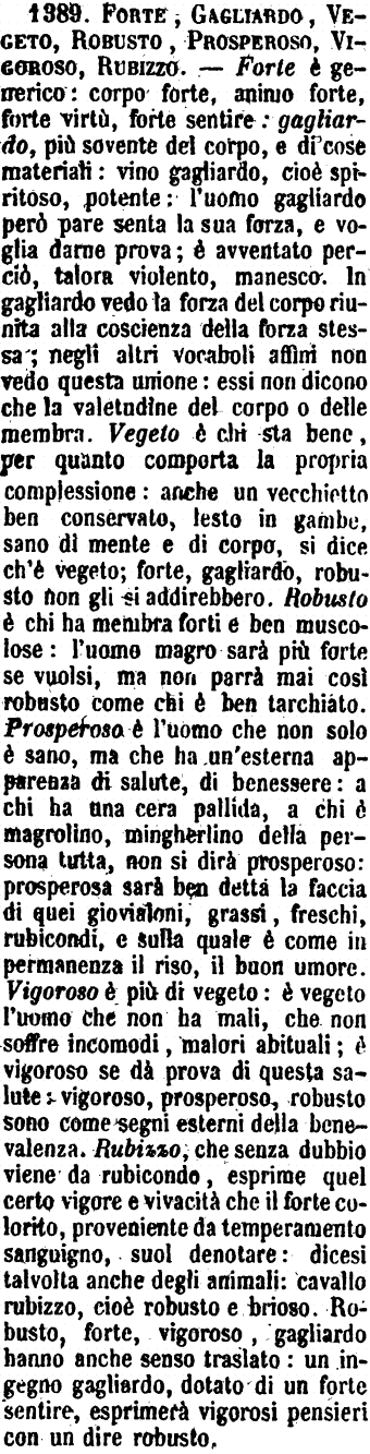 | Forte, Gagliardo, Vegeto, Robusto, Prosperoso, Vigoroso, Rubizzo - Forte è generico: corpo forte, animo forte, forte virtù, forte sentire: gagliardo, più sovente del corpo, e di cose materiali: vino gagliardo, cioè spiritoso, potente: l'uomo gagliardo però pare senta la sua forza, e voglia darne prova; è avventato perciò, talora violento, manesco. In gagliardo vedo la forza del corpo riunita alla coscienza della forza stessa; negli altri vocaboli affini non vedo questa unione: essi non dcono che la valetudine del corpo o delle membra. Vegeto è chi sta bene, per quanto comporta la propria complessione: anche un vecchietto ben conservato, lesto in gambe, sano di mente e di corpo, si dice ch'è vegeto; forte, gagliardo, robusto non gli si addirebbero. Robusto è chi ha membra forti e ben muscolose: l'uomo magro sarà più forte se vuolsi, ma non parrà mai così robusto come chi è ben tarchiato. Prosperoso è l'uomo che non solo è sano, ma che ha un'esterna apparenza di salute, di benessere: a chi ha una cera pallida, a chi è magrolino, mingherlino della persona tutta, non si dirà prosperoso: prosperosa sarà ben detta la faccia di quei giovialoni, grassi, freschi, rubicondi, e sulla quale è come in permanenza il riso, il buon umore. Vigoroso è più di vegeto: è vegeto l'uomo che non ha mali, che non soffre incomodi, malori abituali; è vigoroso se dà prova di questa salute; vigoroso, prosperoso, robusto sono come segni esterni della benevalenza. Rubizzo, che senza dubbio viene da rubicondo, esprime quel certo vigore e vivacità che il forte colorito, proveniente da temperamento sanguigno, suol denotare: dicesi talvolta anche degli animali: cavallo rubizzo, cioè robusto e brioso. Robusto, forte, vigoroso, gagliardo hanno anche senso traslato: un ingegno gagliardo, dotato di un forte sentire, esprimerà vigorosi pensieri con un dire robusto. [immagine] |