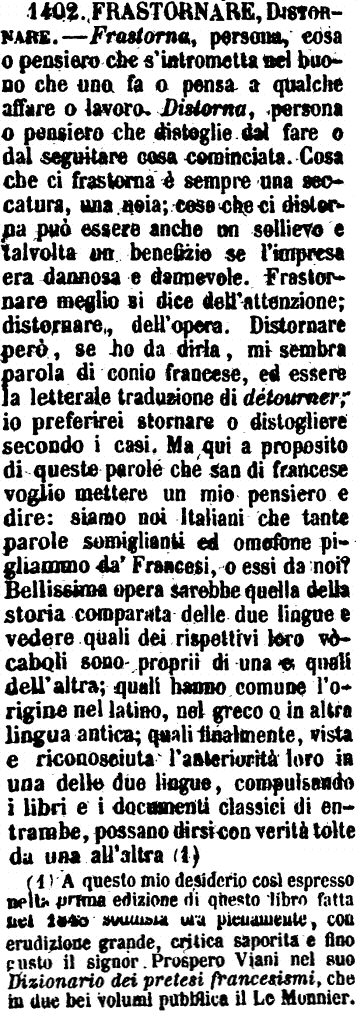 | Frastornare, Distornare - Frastorna, persona, cosa o pensiero che s'intrometta nel buono che uno fa o pensa a qualche affare o lavoro. Distorna, persona o pensiero che distoglie dal fare o dal seguitare cosa cominciata. Cosa che ci frastorna è sempre una seccatura, una noia; cosa che ci distorna può essere anche un sollievo e talvolta un benefizio se l'impresa era dannosa e dannevole. Frastornare meglio si dice dell'attenzione; distornare, dell'opera. Distornare però, se ho da dirla, mi sembra parola di conio francese, ed essere la letterale traduzione di détourner; io preferirei stornare o distogliere secondo i casi. Ma qui a proposito di queste parole che san di francese voglio mettere un mio pensiero e dire: siamo noi Italiani che tante parole somiglianti ed omofone pigliammo da' Francesi, o essi da noi? Bellissima opera sarebbe quella della storia comparata delle due lingue e vedere quali dei rispettivi loro vocaboli sono proprii di una e quali dell'altra; quali hanno comune l'origine nel latino, nel greco o in altra lingua antica; quali finalmente, vista e riconosciuta l'anteriorità loro in una delle due lingue, compulsando i libri e i documenti classici di entrambe, possano dirsi con verità tolte da una all'altra (1).