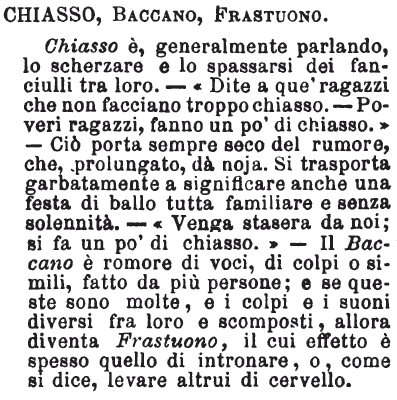 | Chiasso, Baccano, Frastuono - Chiasso è, generalmente parlando, lo scherzare e lo spassarsi dei fanciulli tra loro. - « Dite a que' ragazzi che non facciano troppo chiasso. - Poveri ragazzi, fanno un po' di chiasso.» - Ciò porta sempre seco del rumore, che, prolungato, dà noja. Si trasporta garbatamente a significare anche una festa di ballo tutta familiare e senza solennità. - « Venga stasera da noi; si fa un po' di chiasso.» - Il Baccano è romore di voci, di colpi o simili, fatto da più persone; e se queste sono molte, e i colpi e i suoni diversi fra loro e scomposti, allora diventa Frastuono , il cui effetto è spesso quello di intronare, o, come si dice, levare altrui di cervello. [immagine] |