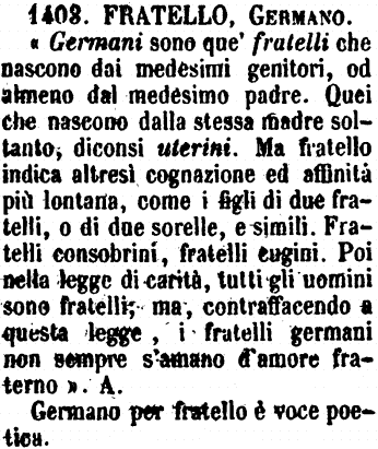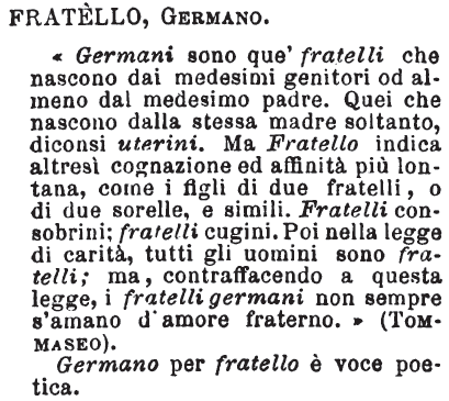 | Fratello, Germano - «Germani sono que' fratelli che nascono dai medesimi genitori od almeno dal medesimo padre. Quei che nascono dalla stessa madre soltanto, diconsi uterini. Ma Fratello indica altresì cognazione ed affinità più lontana, come i figli di due fratelli, o di due sorelle, e simili. Fratelli consobrini; fratelli cugini. Poi nella legge di carità, tutti gli uomini sono fratelli; ma, contraffacendo a questa legge, i fratelli germani non sempre s'amano d'amore fraterno.» (Tommaseo).