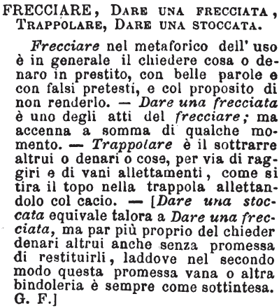 | Frecciare, Dare una frecciata, Trappolare, Dare una stoccata - Frecciare nel metaforico dell'uso è in generale il chiedere cosa o denaro in prestito, con belle parole e con falsi pretesti, e col proposito di non renderlo. - Dare una frecciata è uno degli atti del frecciare; ma accenna a somma di qualche momento. -Trappolare è il sottrarre altrui o denari o cose, per via di raggiri e di vani allettamenti, come si tira il topo nella trappola allettandolo col cacio. - [Dare una stoccata equivale talora a Dare una frecciata, ma par più proprio del chieder denari altrui anche senza promessa di restituirli, laddove nel secondo modo questa promessa vana o altra bindoleria è sempre come sottintesa. G. F.] [immagine] |