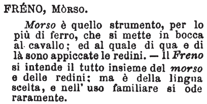 | Freno - S. m. Aff. al lat. aureo Fraenum. Strumento per lo più di ferro che si mette in bocca ai cavalli, muli, e sim., appiccato alle redini per reggerli e maneggiarli e guidarli, altrimenti detto Morso. (Fanf.) Bocc. Nov. 99. 11. (C) A' quali subitamente furono dintorno a' freni e alle staffe. G. V. 4. 18. 3. Avendo ornato il suo cavallo di freno d'oro fine, e ferrato di fine ariento. Tes. Br. 7. 74. Freno d'oro non fa migliore cavallo. Dant. Purg. 10. E una vedovella gli era al freno, Di lagrime atteggiata e di dolore. But. Purg. 16. 2. Il freno non guida lo cavallo, se non è chi guidi lo freno; così le leggi non correggerebbono lo sfrenato appetito se non fusse chi guidasse le leggi. E appresso: Poner mano al freno è operare lo freno a dirizzare lo cavallo. T. Ar. Fur. 46. 23. La… incantatrice, la qual messo Freno e sella a uno spirto avea quel giorno. [B.] E 1. 11. Torcere il… E 12. 75. Reggere il… E 27. 70 Ricco, Spumoso. E 42. 1. Duro. = Alam. Eleg. 1. 11. (Mt.) Nè posto avea Al feroce corsier la sella e 'l freno. G. V. 8. 35. 3. (Man.) Sono (i cavalli de' Tartari) con sottili briglie senza freno.