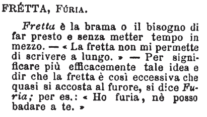 Fretta, Furia - Fretta è la brama o il bisogno di far presto e senza metter tempo in mezzo. - «La fretta non mi permette di scrivere a lungo.» - Per significare più efficacemente tale idea e dir che la fretta è così eccessiva che quasi si accosta al furore, si dice Furia; per es.: «Ho furia, nè posso badare a te.» [immagine]