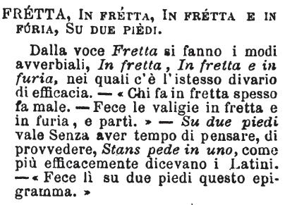 Fretta, In fretta, In fretta e in furia, Su due piedi - Dalla voce Fretta si fanno i modi avverbiali, In fretta, In fretta e in furia, nei quali c'è l'istesso divario di efficacia. - «Chi fa in fretta spesso fa male. - Fece le valigie in fretta e in furia, e partì.» - Su due piedi vale Senza aver tempo di pensare, di provvedere, Stans pede in uno, come dicevano i Latini. - «Fece lì su due piedi questo epigramma.» [immagine]