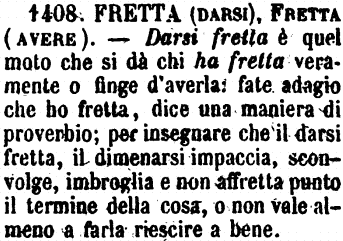 11. Per fretta, post. avverb., vale pure Facilmente. Alleg. 149. (M.) Non si lascia veder così per fretta a noi altri sgraziati vetturali. Salvin. Cas. 121. Di niuna latina poesia tu troverai così per fretta nome più antico di questo. Canig. Rist. 42. (Man.) E a cui aggrappa non lascia per fretta,…