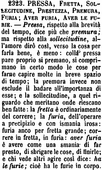 Pressa, Fretta, Sollecitudine, Prestezza, Premura, Furia; Aver furia, Aver le furie - Pressa, rispetto alla brevità del tempo, dice più che premura; ma rispetto alla sollecitudine, all'amore dirò così, verso la cosa per farla bene, è meno: colla pressa pare proprio si premano, si comprimano in certo modo le cose per farne capire molte in breve spazio di tempo; la premura invece non esclude il badare all'importanza di esse; e la sollecitudine, a quel riguardo che meritano onde riescano ben fatte: la fretta è ordinariamente del correre; la furia, dell'operare a precipizio e con ismania irosa: furia anco per fretta grande; correre in fretta, in furia: aver furia è avere come una smania di far presto, di sbrigare le cose, di finirle; e chi vede altri agire così dice: ha le furie; cioè ha le furie in corpo. [immagine]