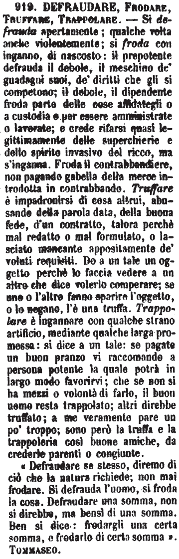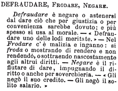 «Defraudare se stesso, diremo di ciò che la natura richiede; non mai frodare. Si defrauda l'uomo, si froda la cosa. Defraudare una somma, non si direbbe, ma bensì di una somma. Ben si dice: frodargli una certa somma, e frodarlo di certa somma». Tommaseo. [immagine] |