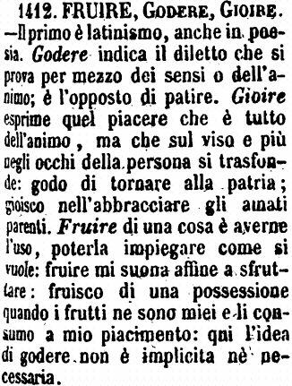 | Fruire, Godere, Gioire - Il primo è latinismo, anche in poesia. Godere indica il diletto che si prova per mezzo dei sensi o dell'animo; è l'opposto di patire. Gioire esprime quel piacere che è tutto dell'animo, ma che sul viso e più negli occhi della persona si trasfonde: godo di tornare alla patria; gioisco nell'abbracciare gli amati parenti. Fruire di una cosa è averne l'uso, poterla impiegare come si vuole: fruire mi suona affine a sfruttare: fruisco di una possessione quando i frutti ne sono miei e li consumo a mio piacimento: qui l'idea di godere non è implicita nè necessaria. [immagine] |
