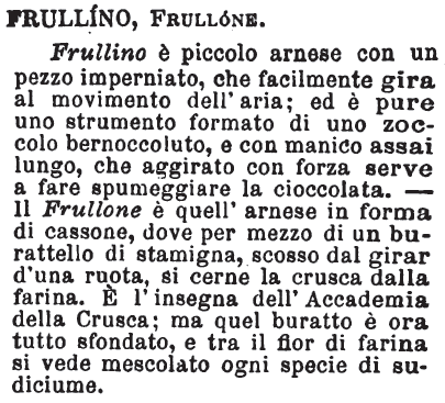 | Frullino, Frullone - Frullino è piccolo arnese con un pezzo imperniato, che facilmente gira al movimento dell'aria; ed è pure uno strumento formato di uno zoccolo bernoccoluto, e con manico assai lungo, che aggirato con forza serve a fare spumeggiare la cioccolata. - Il Frullone è quell'arnese in forma di cassone, dove per mezzo di un burattello di stamigna, scosso dal girar d'una ruota, si cerne la crusca dalla farina. È l'insegna dell'Accademia della Crusca; ma quel buratto è ora tutto sfondato, e tra il fior di farina si vede mescolato ogni specie di sudiciume. [immagine] |