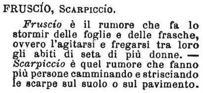 | Fruscio, Scarpiccio - Fruscìo è il rumore che fa lo stormir delle foglie e delle frasche, ovvero l'agitarsi e fregarsi tra loro gli abiti di seta di più donne. - Scarpiccio è quel rumore che fanno più persone camminando e strisciando le scarpe sul suolo o sul pavimento. [immagine] |