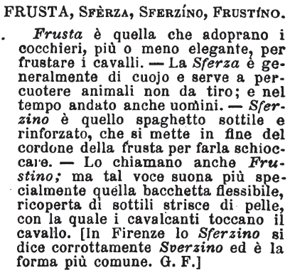 | Frusta, Sferza, Sferzino, Frustino - Frusta è quella che adoprano i cocchieri, più o meno elegante, per frustare i cavalli. - La Sferza è generalmente di cuojo e serve a percuotere animali non da tiro; e nel tempo andato anche uomini. - Sferzino è quello spaghetto sottile e rinforzato, che si mette in fine del cordone della frusta per farla schioccare. - Lo chiamano anche Frustino; ma tal voce suona più specialmente quella bacchetta flessibile, ricoperta di sottili strisce di pelle, con la quale i cavalcanti toccano il cavallo. [In Firenze lo Sferzino si dice corrottamente Sverzino ed è la forma più comune. G.F.] [immagine] |