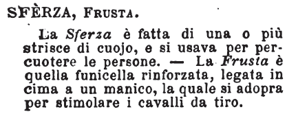 | Sferza, Frusta - La Sferza è fatta di una o più strisce di cuojo, e si usava per percuotere le persone. - La Frusta è quella funicella rinforzata, legata in cima a un manico, la quale si adopra per stimolare i cavalli da tiro. [immagine] |