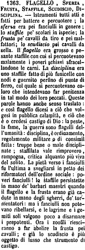 | Flagello, Sferza, Frusta, Staffile, Scudiscio, Disciplina - Istrumenti tutti atti e fatti per battere e percuotere; la sferza era pei fanciulli in genere; lo staffile pe' scolari in ispecie; la frusta pe' cavalli da tiro e pei malfattori; lo scudiscio pei cavalli da sella. Il flagello era grosso e pesante staffile con cui si percuotevano malamente i poveri schiavi sfracellandone le carni. La disciplina era uno staffile fatto di più funicelle con nodi e guernito perfino di punte di ferro, col quale si percuotevano coloro che intendevano far penitenza in tal modo dei loro peccati. Queste parole hanno anche senso traslato: e così flagello dicesi a ciò che volgesi in pubblica calamità, e ciò che è o credesi castigo di Dio: la peste, la fame, la guerra sono flagelli dell'umanità: disciplina, è ordinamento, regolamento militare o di consimil fatta: truppe bene o male disciplinate; staffilata vale rimprovero, rampogna, critica alquanto più viva del solito. La pietà verso i fanciulli fu l'ultima a svegliarsi in petto dei riformatori dell'ordine sociale: poveri fanciulli! lo staffile persistette in mano de' barbari maestri quando il flagello e la frusta erano già cadute in mano degli sgherri, de' tormentatori: ma i fanciulli non potevano ribellarsi, e le lagrime e i gemiti soli valgono poco a disarmare i prepotenti. Ora i zoofili riesciranno a far abolire la frusta pei cavalli; e già lo scudiscio è più oggetto di lusso che strumento di castigo. [immagine] |