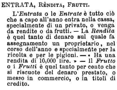 | Entrata, Rendita, Frutti - L'Entrata o le Entrate è tutto ciò che a capo all'anno entra nella cassa, specialmente di un privato, o venga da rendite o da frutti. - La Rendita è quel tanto di denato sul quale fa assegnamento un proprietario, nel corso dell'anno e specialmente per la ricolta e per le pigioni. - «Ha una rendita di 10,000 lire.» - Il Frutto o i Frutti è quel tanto per cento che si riscuote del denaro prestato, o messo in commercio, o in titoli di credito. [immagine] |