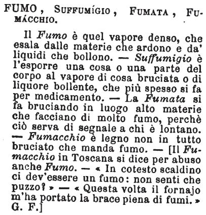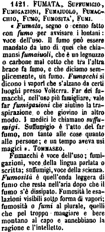 Fumata, Suffumigio, Fumigazioni, Fumaiuolo, Fumacchio, Fumo, Fumosità, Fumi - «Fumata, segno o cenno fatto con fumo per avvisare i lontani: voce dell'uso. Il fumo può essere mandato da uno di quei che chiamansi fumaiuoli, che è un legnuzzo o carbone mal cotto che tra l'altra brace fa fumo, e che diciamo semplicemente, un fumo. Fumacchi si dicono i vapori che s'alzano da certi luoghi presso Volterra. Far dei fumacchi, nell'uso più famigliare, vale far fumigazioni che aiutino la traspirazione o che giovino in altro modo. I medici le chiamano suffumigi. Suffumigio è l'atto del far fumo, non tanto alle cose quanto alle persone; e un tempo aveva usi magici». Tommaseo.