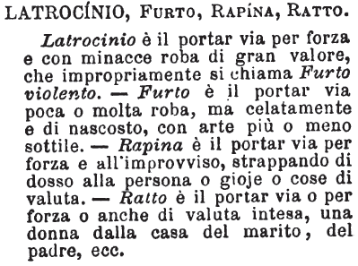 | Latrocinio, Furto, Rapina, Ratto - Latrocinio è il portar via per forza e con minacce roba di gran valore, che impropriamente si chiama Furto violento.- Furto è il portar via poca o molta roba, ma celatamente e di nascosto, con arte più o meno sottile. - Rapina è il portar via per forza e all'improvviso, strappando di dosso alla persona o gioje o cose di valuta. - Ratto è il portar via o per forza o anche di valuta intesa, una donna dalla casa del marito, del padre, ecc. [immagine] |