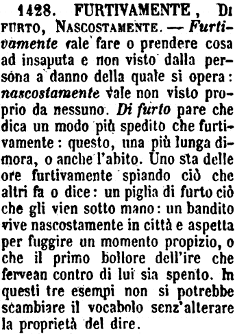 | Furtivamente, Di furto, Celatamente, Nascosamente - Furtivamente vale fare o prendere cosa ad insaputa e non visto dalla persona a danno della quale si opera. - Nascosamente vale non visto proprio da nessuno. - Di furto pare che dica un modo più spedito che furtivamente: questo, una più lunga dimora o anche l'abito. Uno sta delle ore furtivamente spiando ciò che altri fa o dice: uno piglia di furto ciò che gli vien sotto mano: un bandito vive nascosamente in città e aspetta per fuggire un momento propizio o che il primo bollore dell'ire che fervean contro di lui sia spento. In questi tre esempii non si potrebbe scambiare il vocabolo senz'alterare la proprietà del dire. (Zecchini). - [Si noti che Nascosamente suona affettatissimo a' Toscani, che dicono sempre e scrivono (se non sono letterati cruschevoli), Nascostamente. G. F. [immagine] |