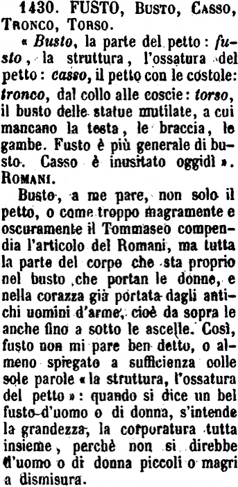 | Fusto, Busso, Casso, Tronco, Torso - « Busto, la parte del petto: fusto, la struttura, l'ossatura del petto: casso, il petto con le costole: tronco, dal collo alle coscie: torso, il busto delle statue mutilate, a cui mancano la testa, le braccia, le gambe. Fusto è più generale di busto. Casso è inusitato oggidì ». Romani.