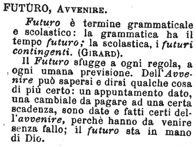 | Futuro, Avvenire - «Futuro è termine grammaticale e scolastico: la grammatica ha il tempo futuro; la scolastica, i futuri contingenti». Girard.
