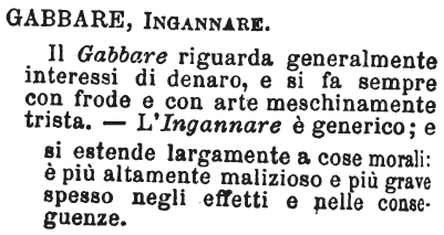 | Gabbare, Ingannare - Il Gabbare riguarda generalmente interessi di denaro, e si fa sempre con frode e con arte meschinamente trista. - L'Ingannare è generico; e si estende largamente a cose morali: è più altamente malizioso e più grave spesso negli effetti e nelle conseguenze. [immagine] |