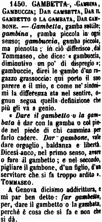 «Dare il gambetto o la gambata è dar con la gamba o col piede nel piede di chi cammina per farlo cadere. Dar gambone, vale dare orgoglio, baldanza e libertà. Dicesi anco, nel primo senso, avere o fare il gambetto; e nel secondo, pigliare il gambone, d'un figlio, d'un servitore che si fa troppo ardito». Tommaseo. A Genova diciamo addirittura, e mi par ben detto: far gambetta, per, dare il gambetto o la gambata, perchè è cosa che si fa e non che si dà. [immagine] |
