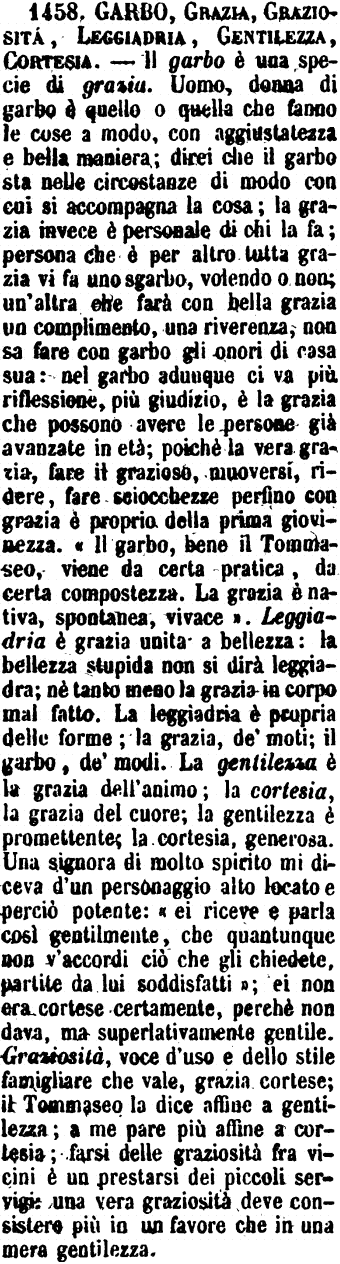 | Garbo, Garbaccio, Fare garbi - Garbo è atto o movimento, specialmente del volto, che più spesso è affettato e spiacevole; onde la frase Fare de' garbi; per es.: «Faceva certi garbi con la bocca che la riconobbi subito.» - Quando si dice Garbaccio si dice apertamente che quel garbo è da riprovarsi come contrario alla civiltà. Spesso vale anche Atti e parole da villani e da screanzati. - «Le facevano sempre de' garbacci, e fu costretta a andarsene.» [immagine] |