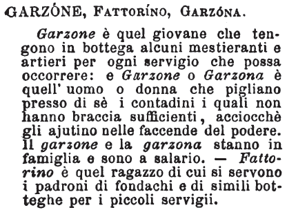 | Garzone, Fattorino, Garzona - Garzone è quel giovane che tengono in bottega alcuni mestieranti e artieri per ogni servigio che possa occorrere: e Garzone o Garzona è quell'uomo o donna che pigliano presso di sè i contadini i quali non hanno braccia sufficienti, acciocchè gli ajutino nelle faccende del podere. Il garzone e la garzona stanno in famiglia e sono a salario. - Fattorino è quel ragazzo di cui si servono i padroni di fondachi e di simili botteghe per i piccoli servigii. [immagine] |